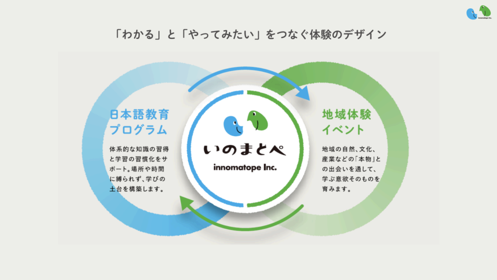 株式会社いのまとぺは、日本語指導が必要な子どもたちに向けた教育プログラムの開発・提供と、地域資源を活用した体験型イベントを軸に、教育と地域の可能性をつなぐ事業を構想しています。